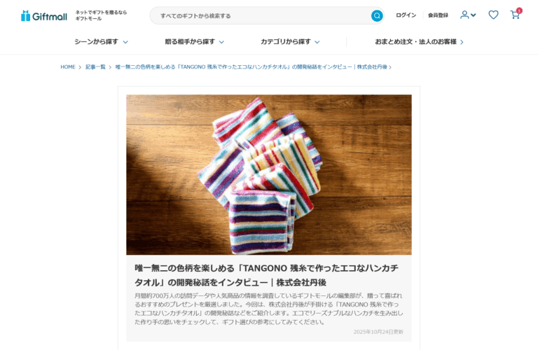 ギフトモールに「TANGONO 残糸で作ったエコなハンカチタオル」の開発裏話などが掲載されました。